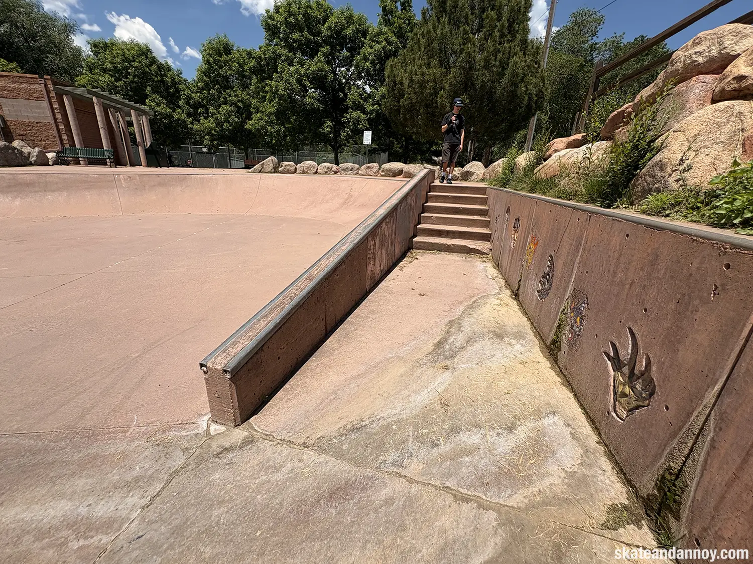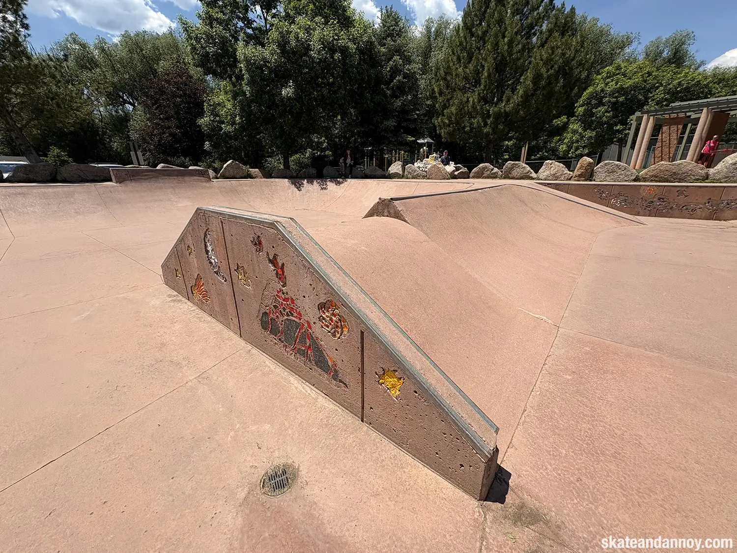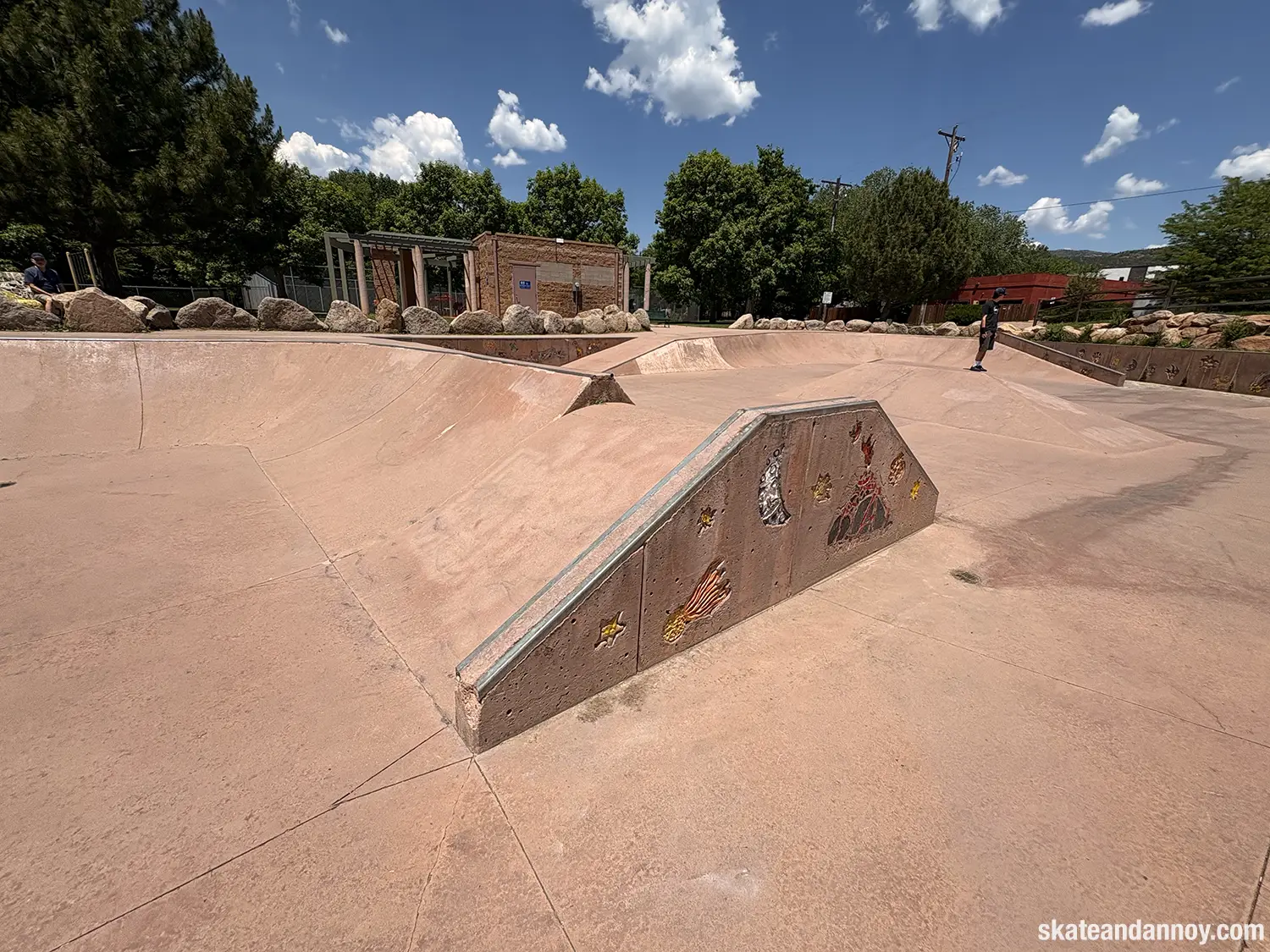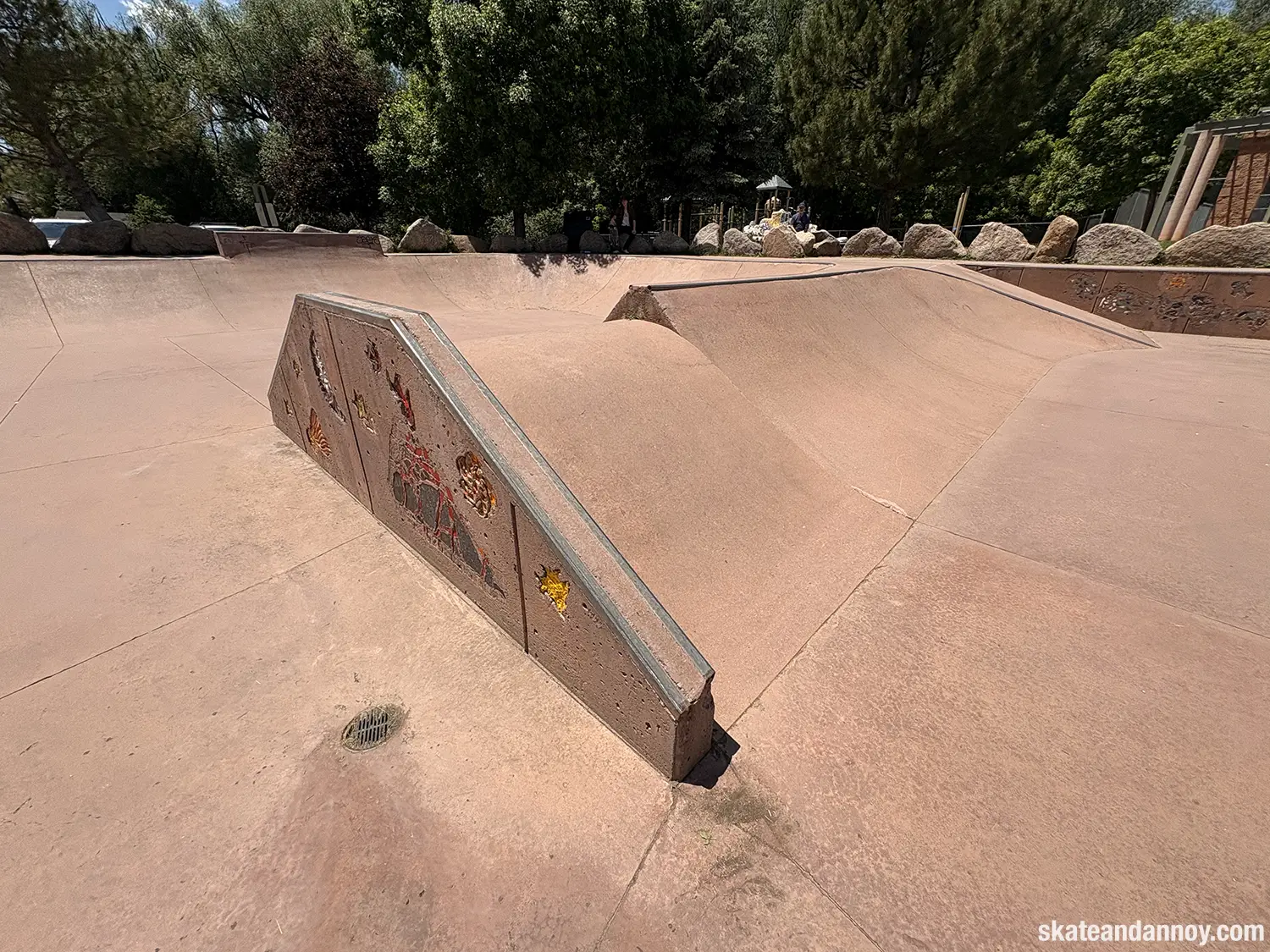 We ended up driving by the Manitou Springs skatepark, so I made the whole family stop while I checked it out. The red cement stands out a bit but doesn’t quite make up for the recessed undersized “noping.” Still, it was fun to roll around a little. The one local there was kind enough to let me try his deck, probably thinking I was going eat shit. I’m not 100% certain but I think the last photo is a mosaic of a dog on a skateboard.