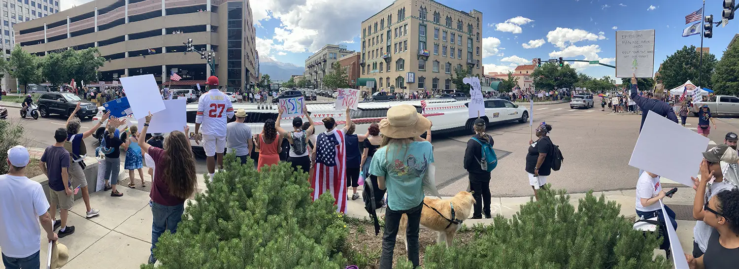 We weren’t sure what the cultural makeup of Colorado Springs would be. We had heard it was pretty conservative, but there was a very healthy turnout for the No Kings protest. I was at a brunch wedding and by the time we got back the hotel the event had been going on for 4 hours or so and was beginning to wind down. Somehow the vibe was extremely positive and joyous almost. There were a couple MAGA hats and t-shirts but they were non-confrontational. That’s not an insanely long stretch limo, I just picked the wrong time to do a panorama. Most of the crowd is across the street.