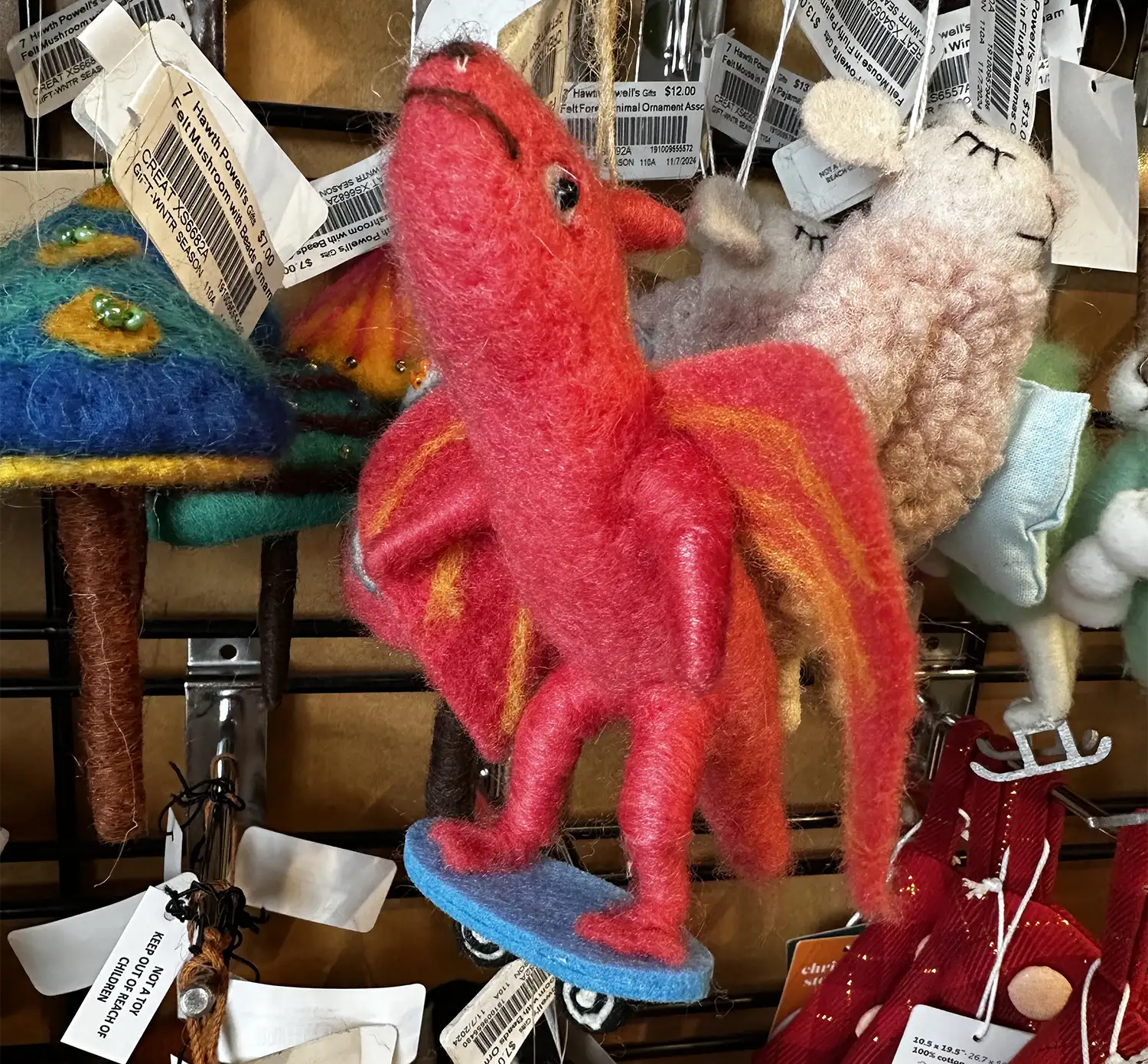 Quite a while back Colin at Unheard sent me pic of this felt dragon on skateboard that he saw at Powells Books. If he told me what the label said I’d link to the producer. Maybe I’ll remember to look for it the next time I visit Powell’s. Is this a toy or an X-mas ornament? You tell me. (Please do, actually.)