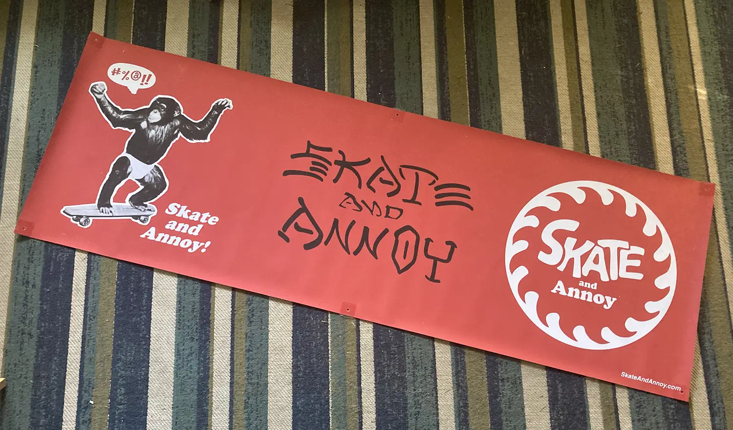 My booth at Sk8 Swap 3 tomorrow is going to be a mess, but if there’s space I’ll be hanging this 2″ x 6″ vinyl banner. Digital printing is a crazy thing. This cost me less than $20. 1986 me would have his mind blown to have a vinyl Skate and Annoy Banner. Heck, 2025 me feels the same way.