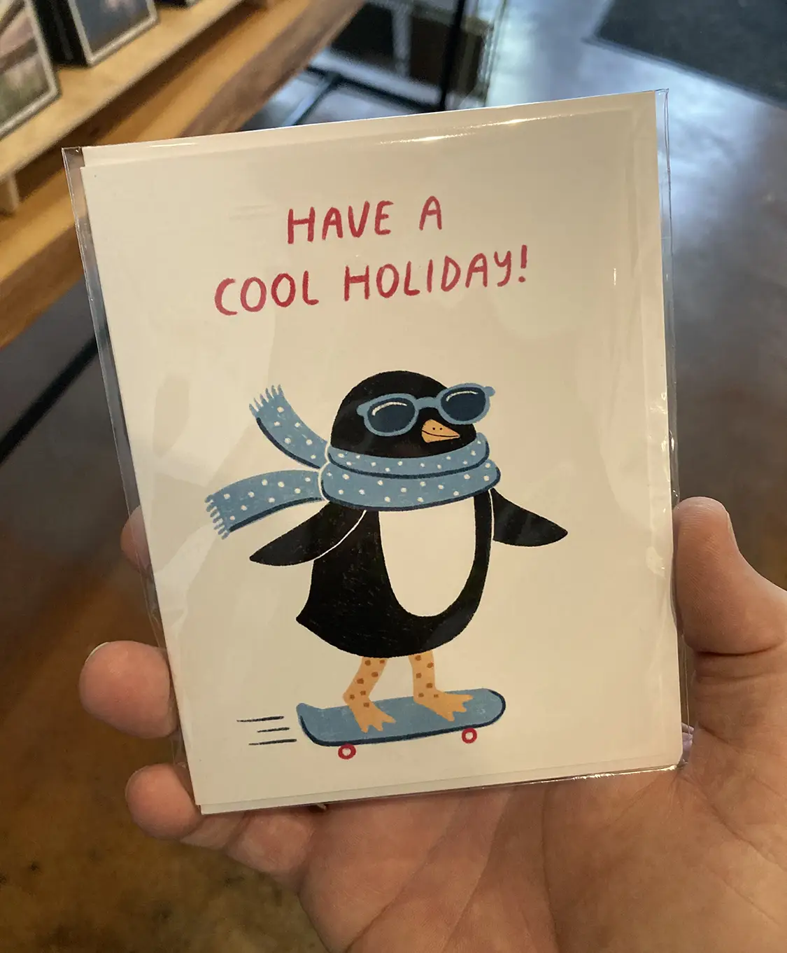 A penguin riding a skateboard is cool. Illustration by Stephanie Brachmann. Get yours at Crafty Wonderland or Etsy. Have a cool holiday, dear readers.