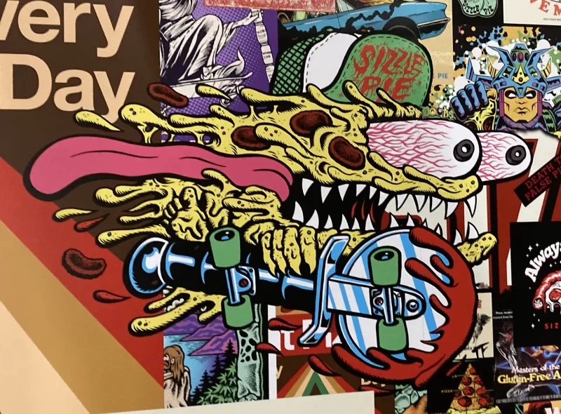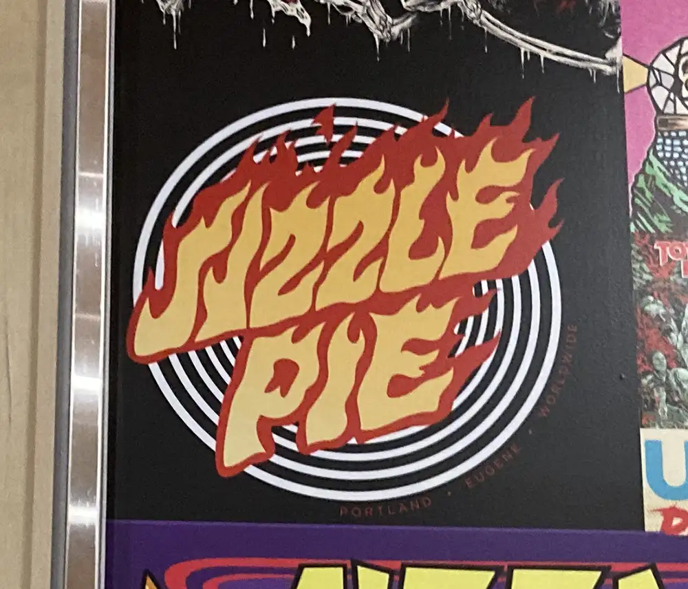 Spotted inside Portland’s amazing new airport, this wall mural for Sizzle Pie pizza. This is not the first time they’ve used skateboard imagery, but somehow I’ve neglected to document it here until now. This is a pretty good appropriation of Keith Meek’s Slasher graphic by the legendary Jim Phillips.