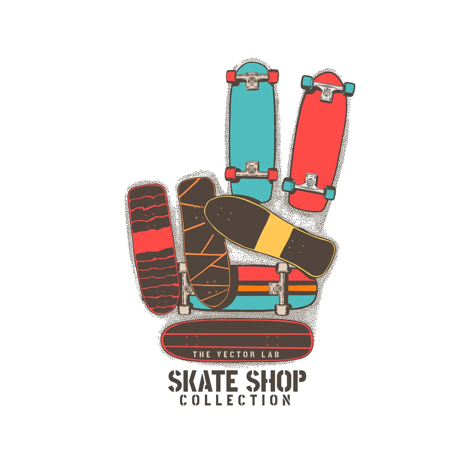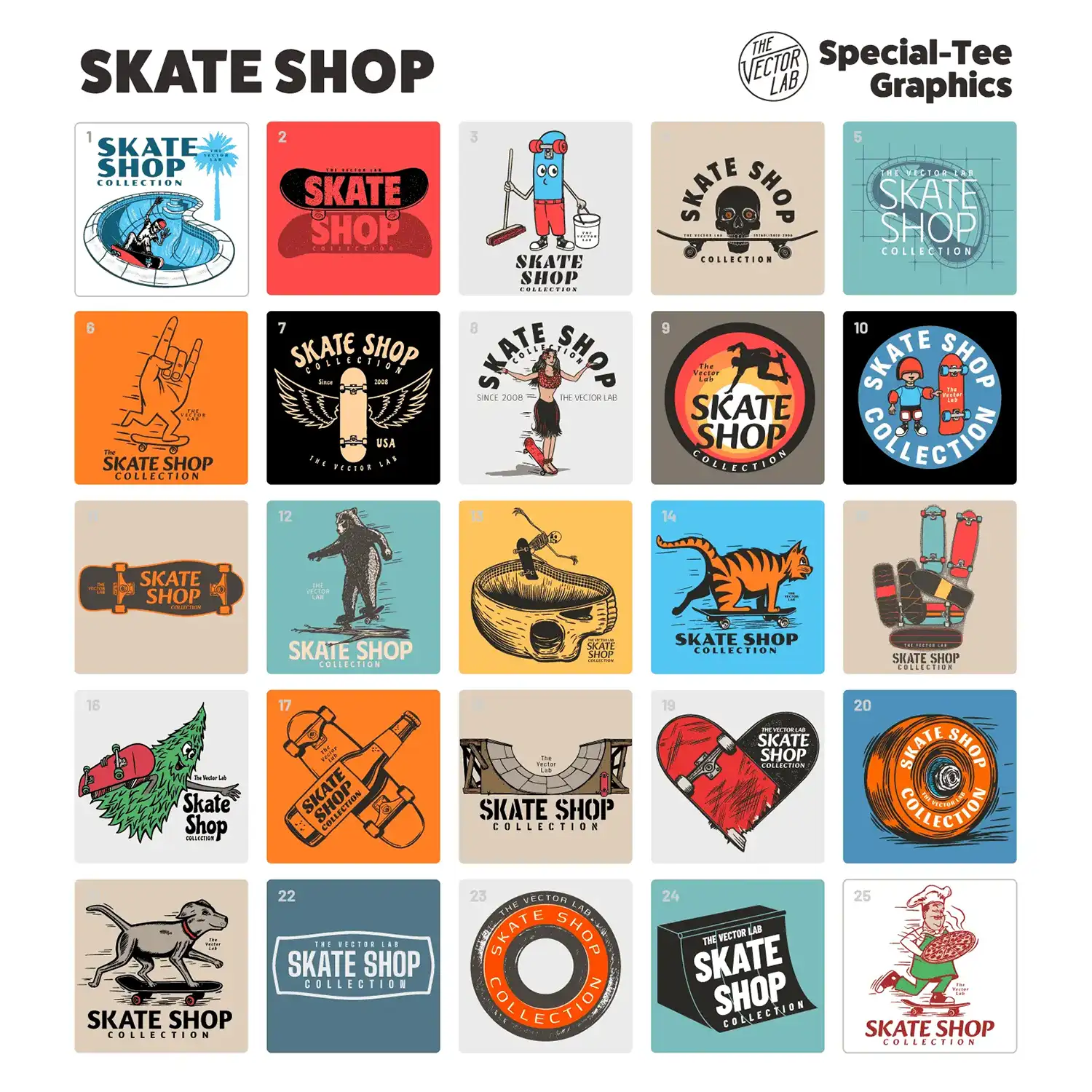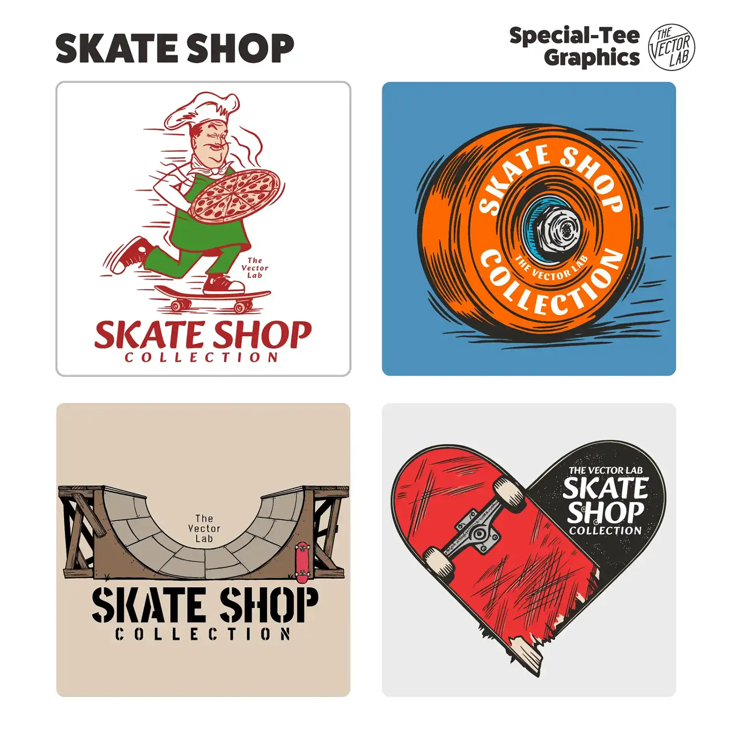 Vector Lab brings you the Skate Shop Collection, a set a templates with editable text that lets you customize (sort of) designs for your skate shop or zine or whatever. The offerings in this collection range from “they sort of get it” to “I ran out of time, here’s some clip art.” I feel sorry for your shop (or brand) if they can’t come up with their own designs. I would like to point out heat the Vector Lab does offer some pretty useful tools for adding effects and textures to existing designs. I’ve even bought from them before. If you see any of these designs in the real world please send pics!