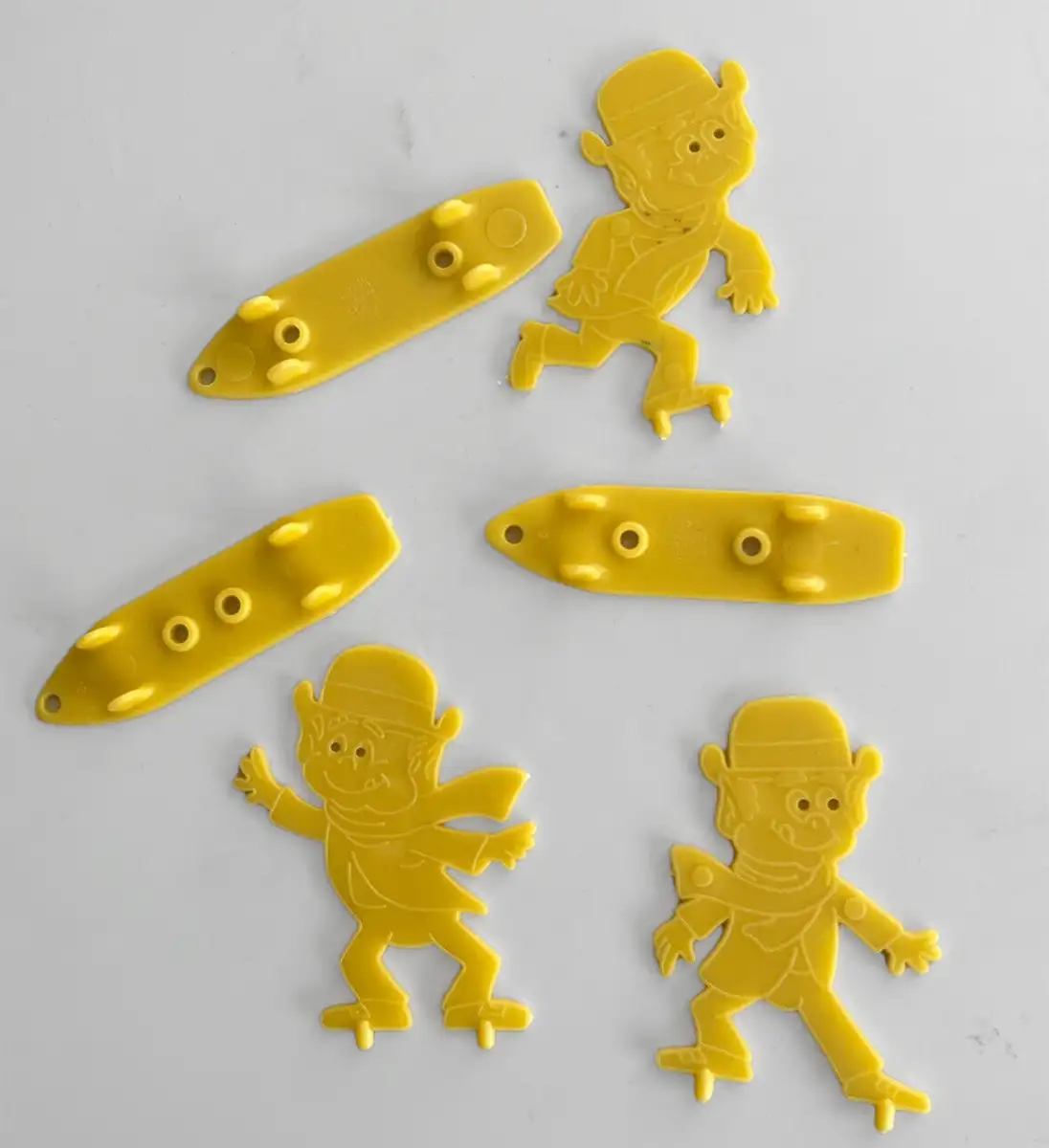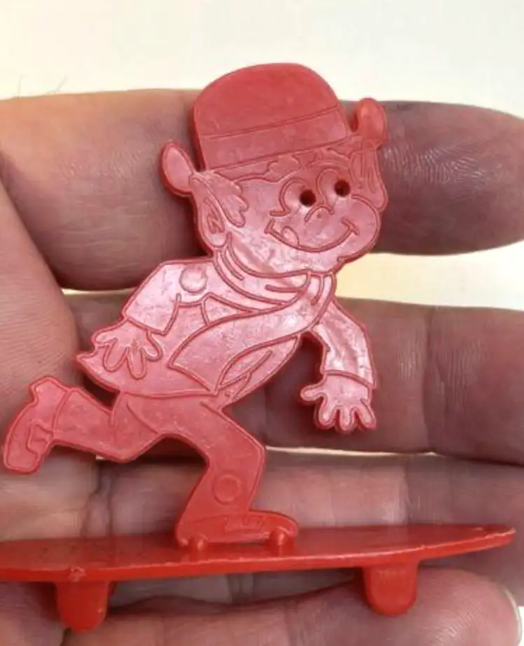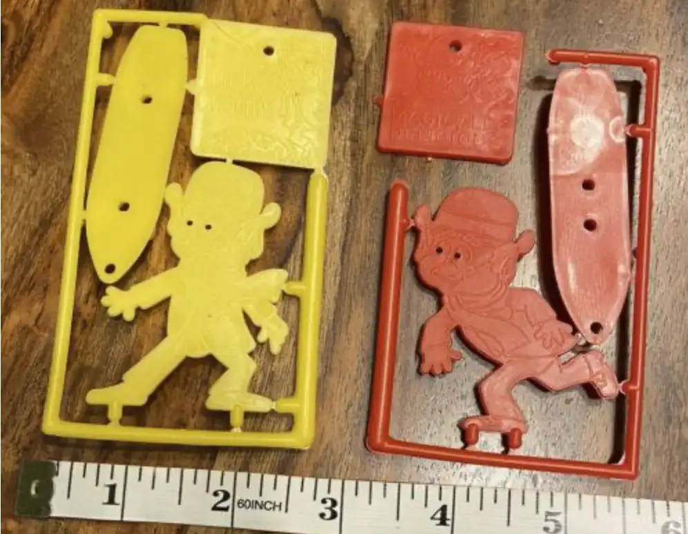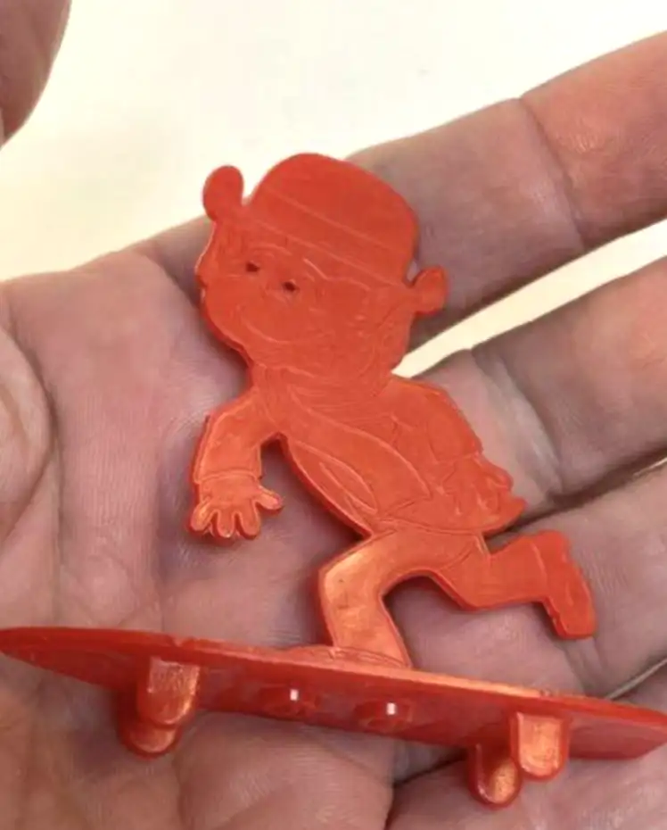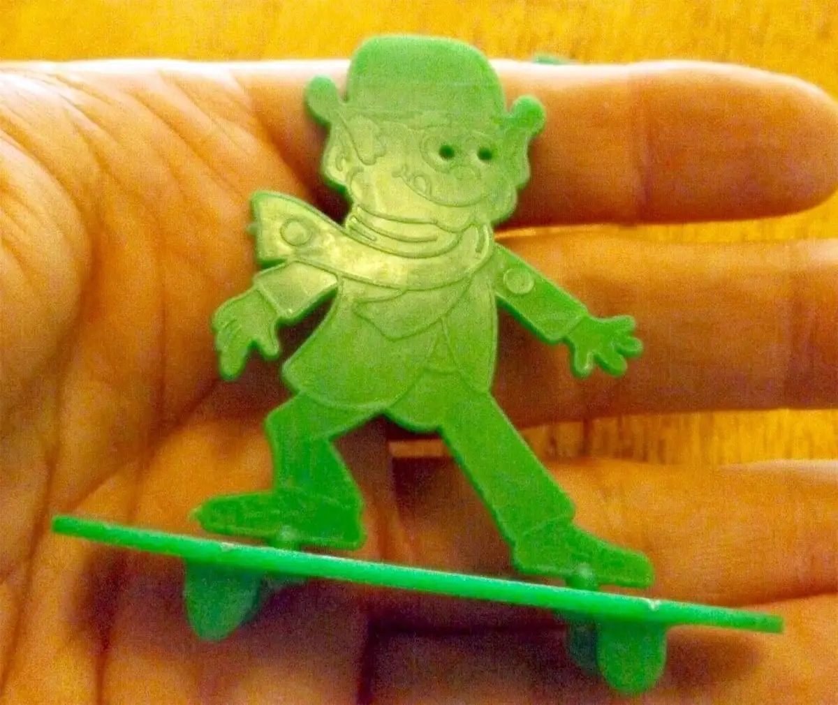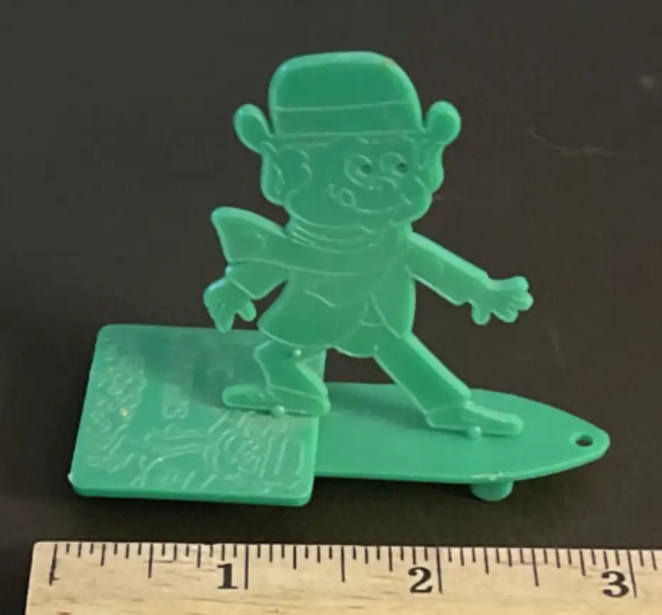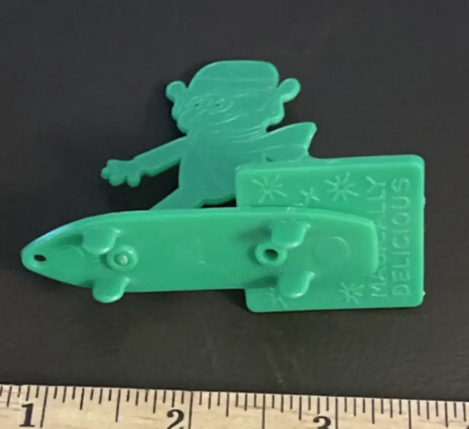 One auction described this toy as a “walker” which made me think of those little figures that wobble down an incline. This clearly isn’t one of those, but one auction did picture a bit of string with one end tied to the nose of the skateboard and the other to the leftover square piece that says “magically delicious.” This may be the intended use because both pieces have a hole punched in them.