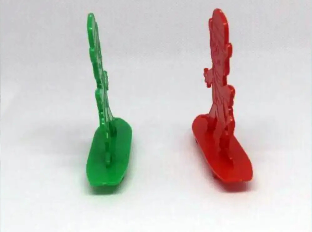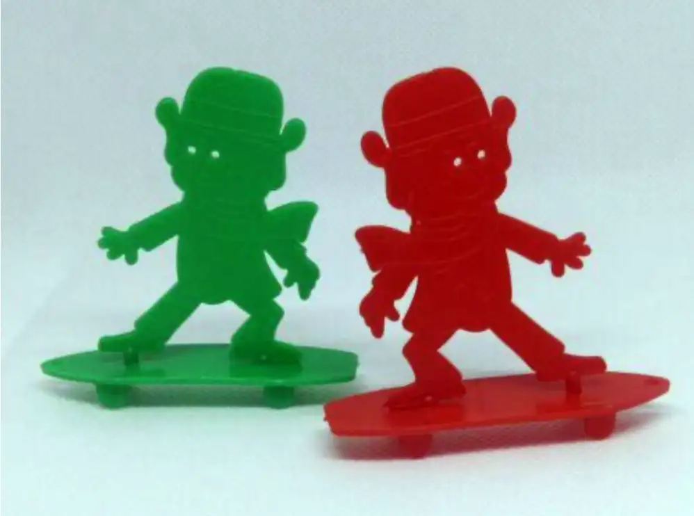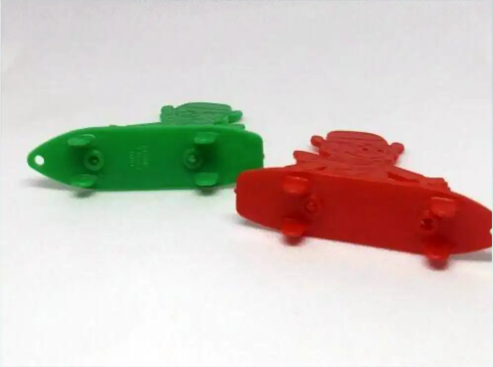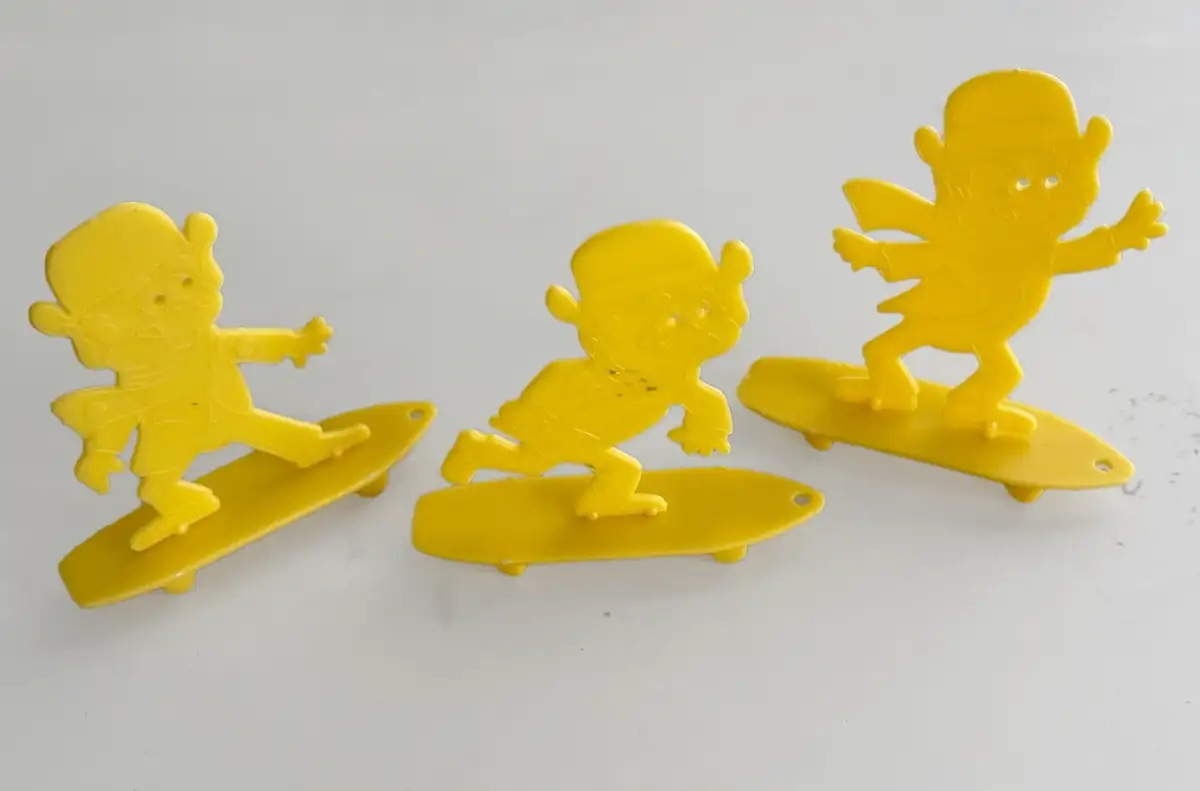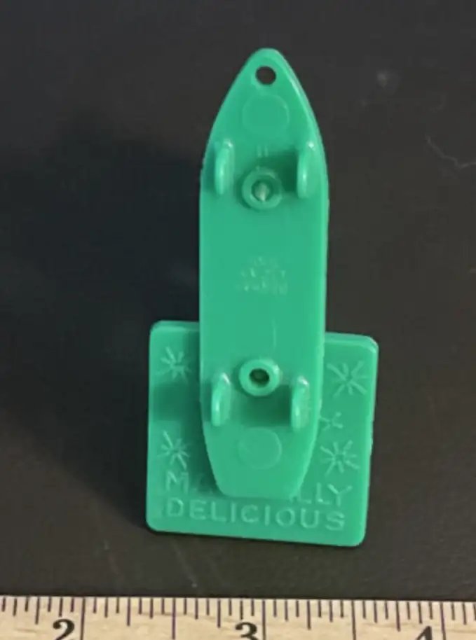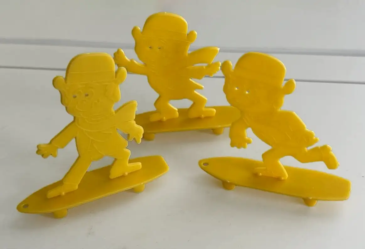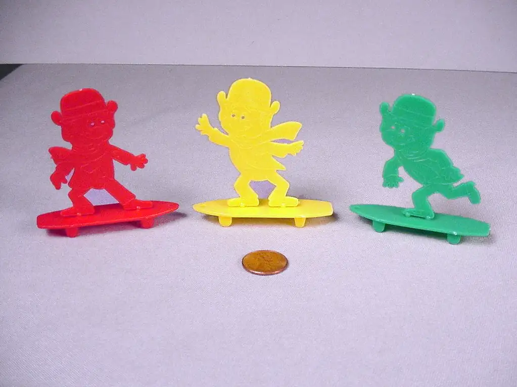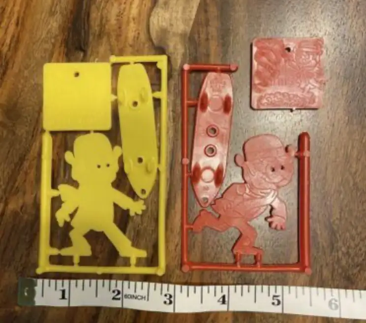 One auction described this toy as a “walker” which made me think of those little figures that wobble down an incline. This clearly isn’t one of those, but one auction did picture a bit of string with one end tied to the nose of the skateboard and the other to the leftover square piece that says “magically delicious.” This may be the intended use because both pieces have a hole punched in them.