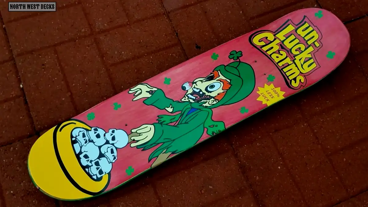 Another thing that turned up was this “Un-Lucky Charms” deck by a YouTube user named North West Decks, who makes his own one-offs. I don’t know why he went through all the work to put the art on the on the top of the deck and not the bottom. Maybe he explains it in the video.