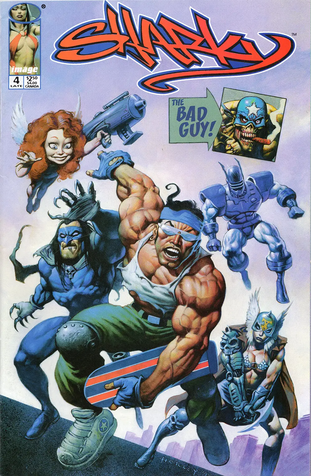 You’re looking at Sharky, Volume 1 #4 published by Image Comics isn 1998. You’d think with a skateboard featured prominently on this glorious cover that one would show up again on the inside pages. Alas, this is not the case. This is puzzling, but the whole comic book is puzzling. It’ shard to read, hard to follow, and feature a zombified (and evil) Captain America and Vampirella. Apparently Vampirella was on loan from another imprint. I’m not sure a how they got around Marvel with the Captain America zombie.