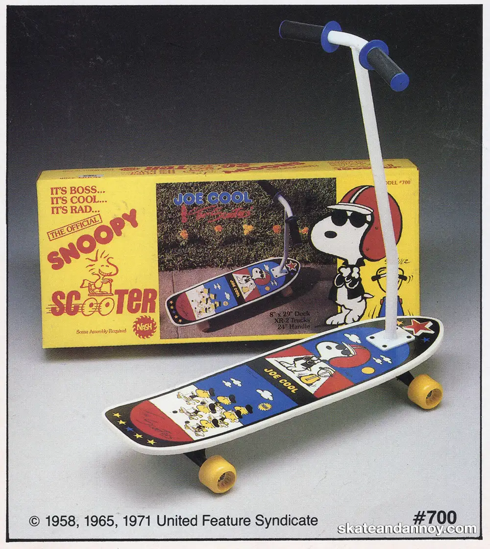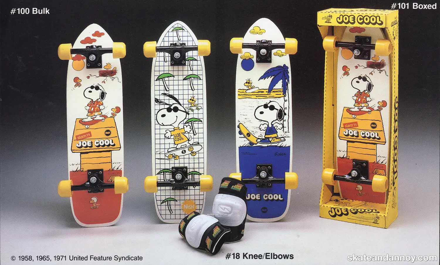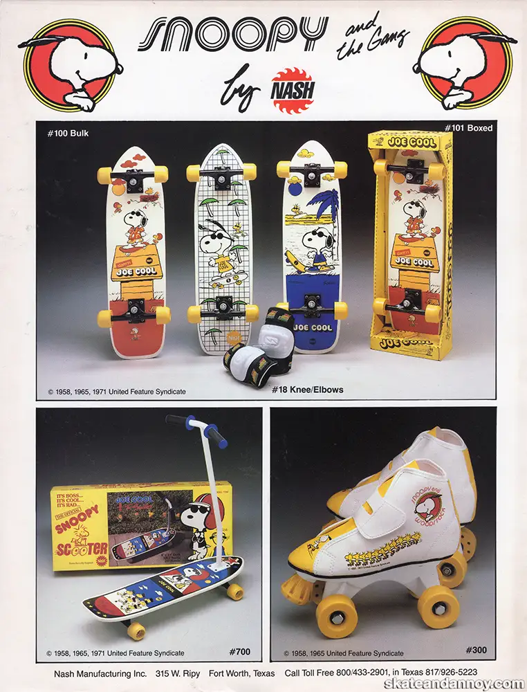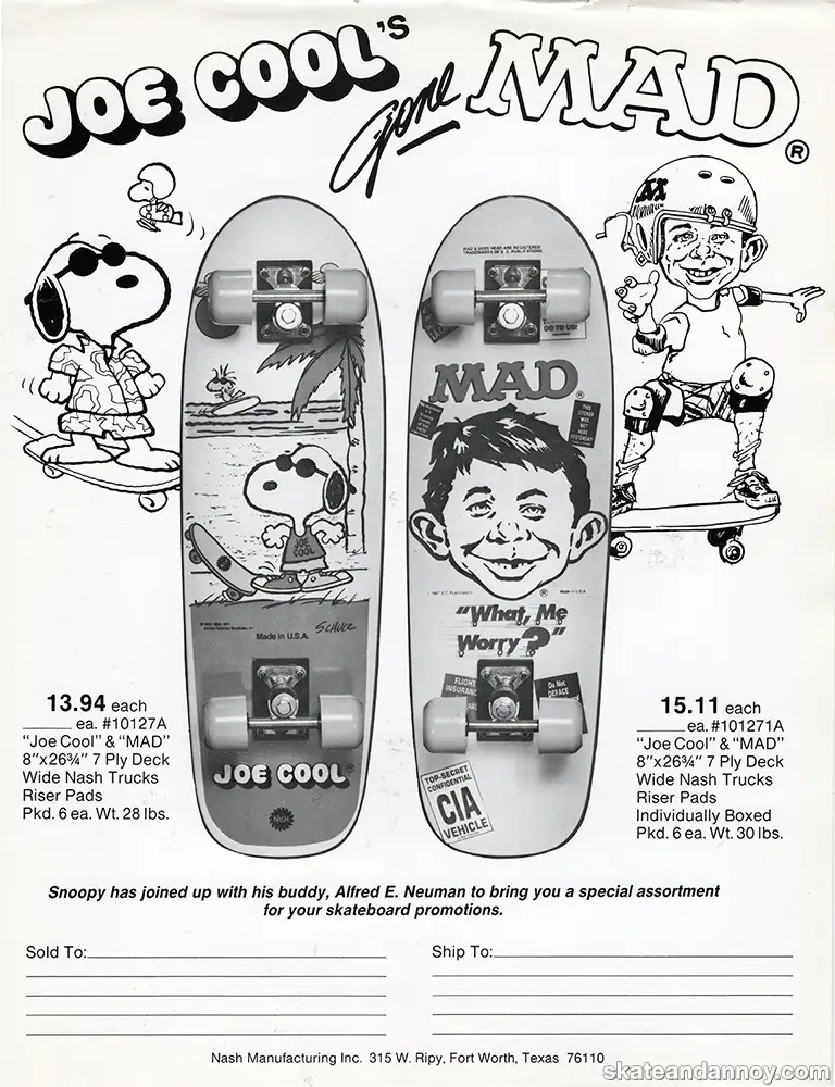 I had a brief not-very-real skateshop that I ran out of my bedroom in the late 80’s. I sent out a bunch of requests for wholesale catalogs and tried to open some accounts. I put together an order based on requests from locals and what I could get ahold of, I ordered some staples like mounting hardware and a roll of grip tape, etc… One of things I got was a Nash catalog. Why get a Nash catalog when the product was so poor? For shits and giggles! It’s one of the few things I kept during the great purge of 1999. Yes, I deeply regret throwing out the rest of it. Joe Cool and Mad could have been their own separate posts, but some of the products appeared on the same page, so click through if you want to see more of Snoopy and Alfred E. Neuman.