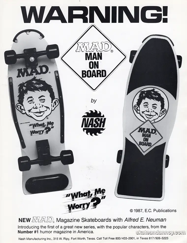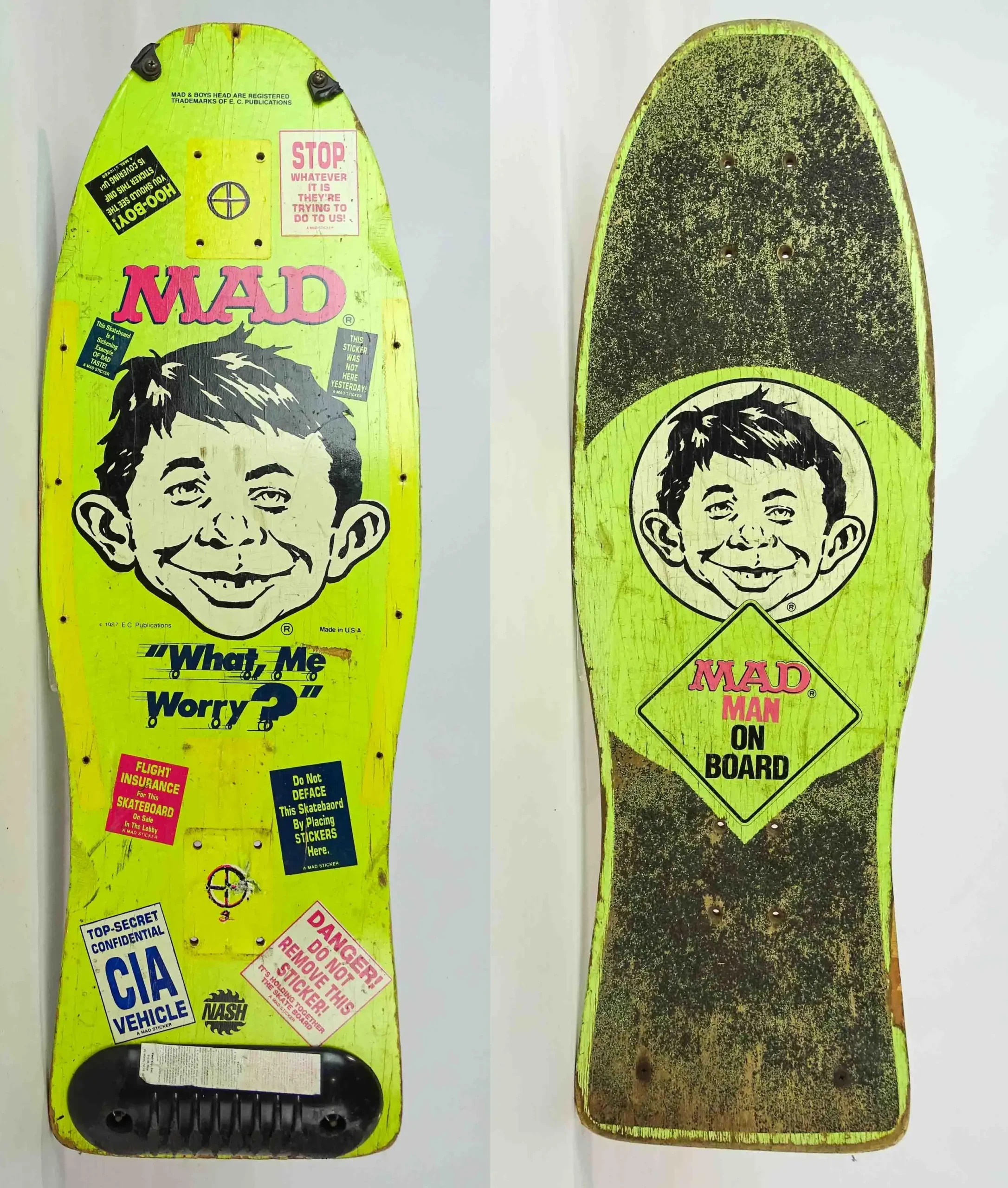 If this is indeed the first ever Alfred E. Neuman skateboard, these can be safely dated to 1987. I’m not sure why they felt the need to add wheels to “What, Me worry?” but it’s kind of amusing.
