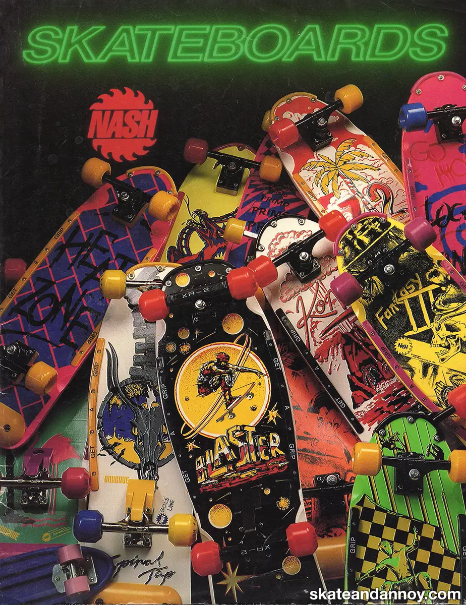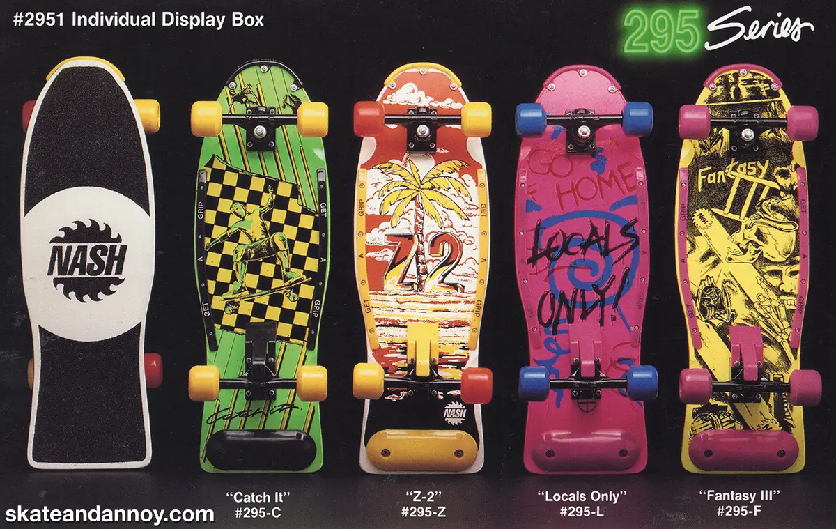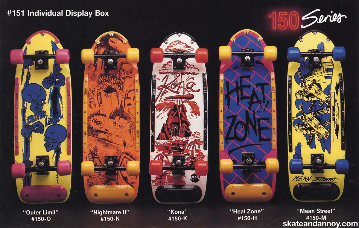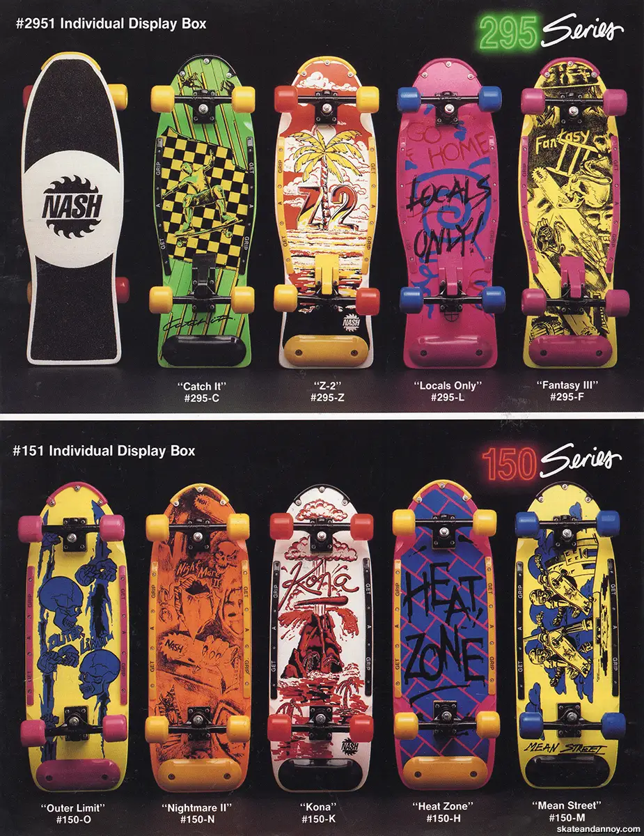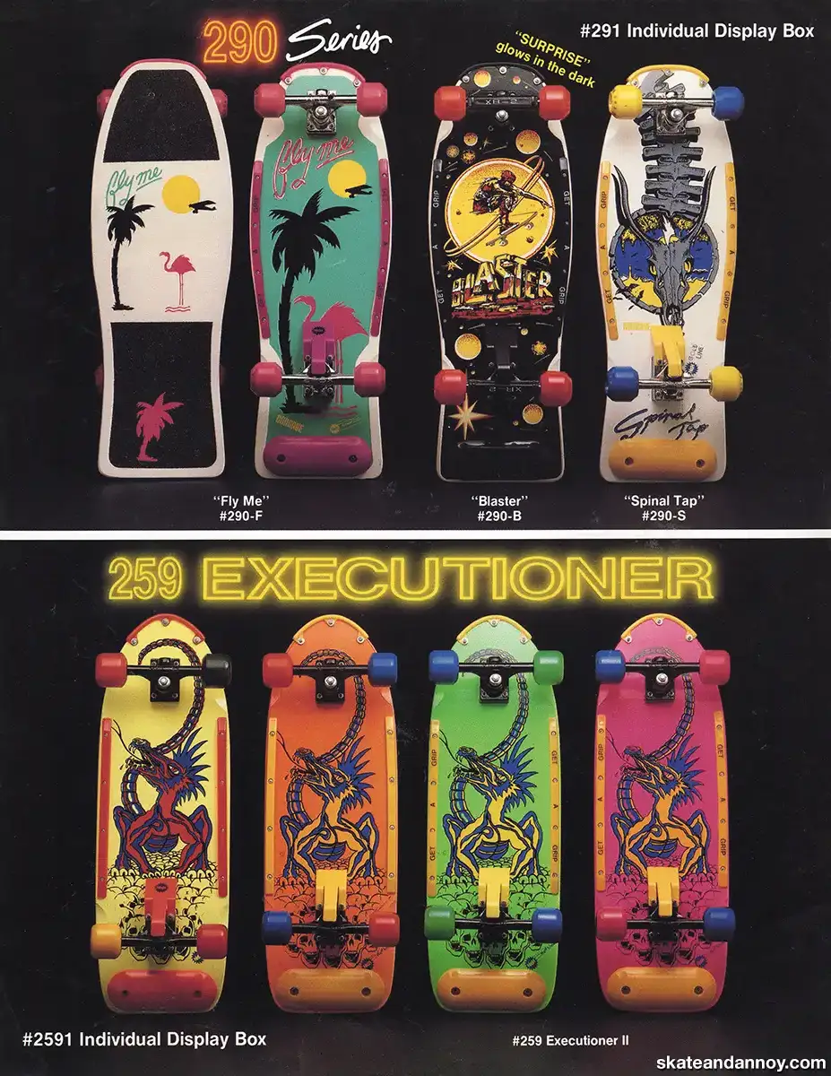 And now for the details… Page 2 featured the most well known Nash Boards, the Fly-Me from the the 290 series and of course, the Executioner II from the 259 Series. Executioner II? Near as I can tell the only difference between the Exexcutioner, and the Executioner II are the color ways. Based on this advert from 1986, The first version had a white dip and two-tone wheels. The Executioner II has two different colored wheels. It’s hard to tell what the reality is though. They could have changed color ways a the drop of a hat, and the Executioner II moniker might have just been a way to suggest it was somehow new. Also o shown on the left, the Blaster and Spinal Tap. These boards definitely did not go to 11.