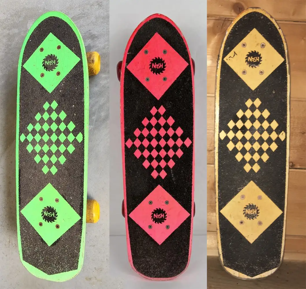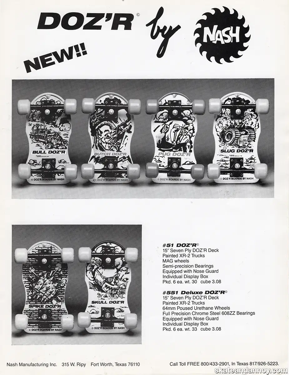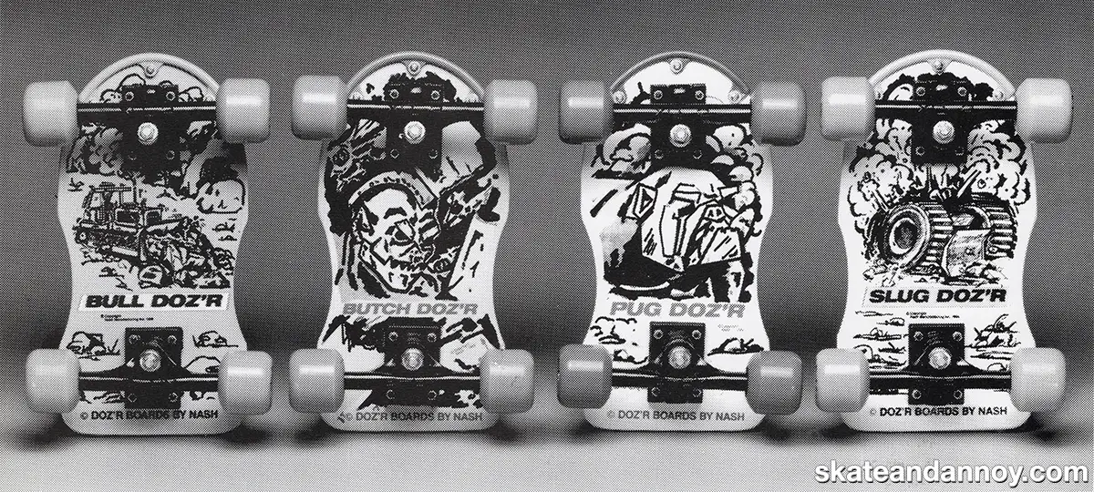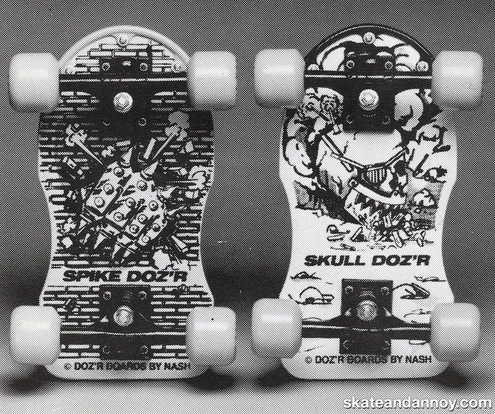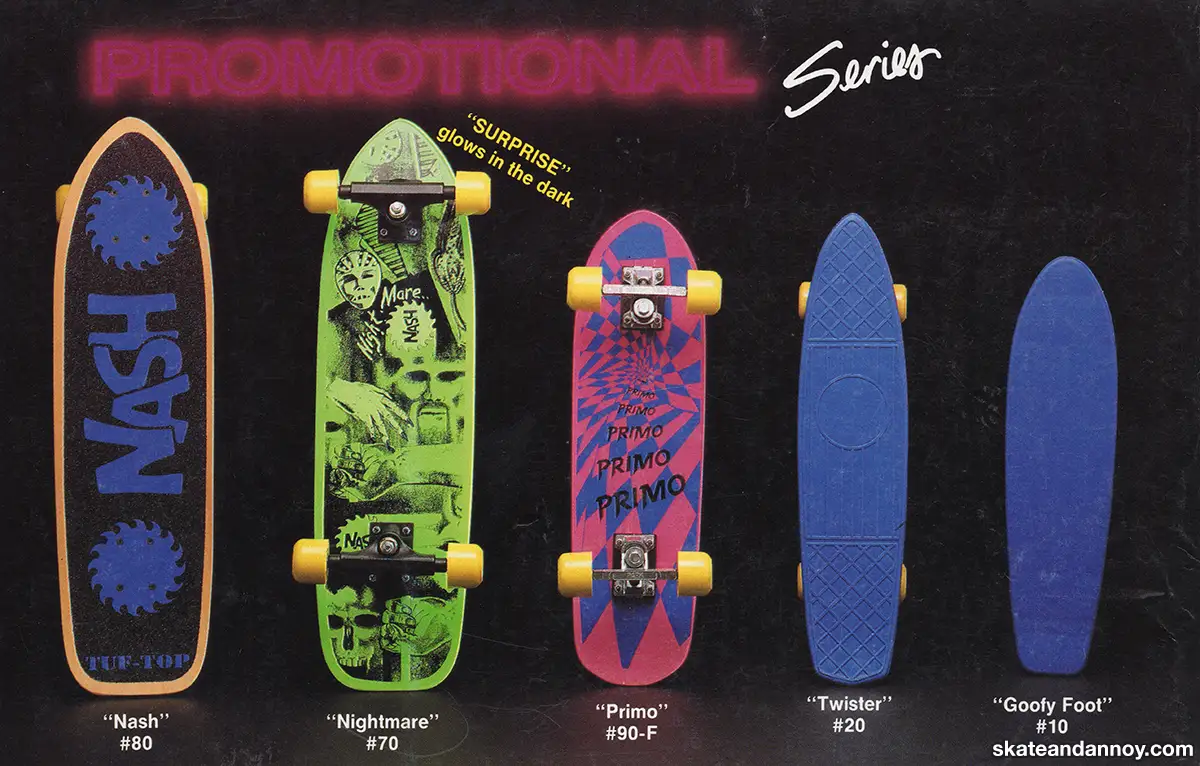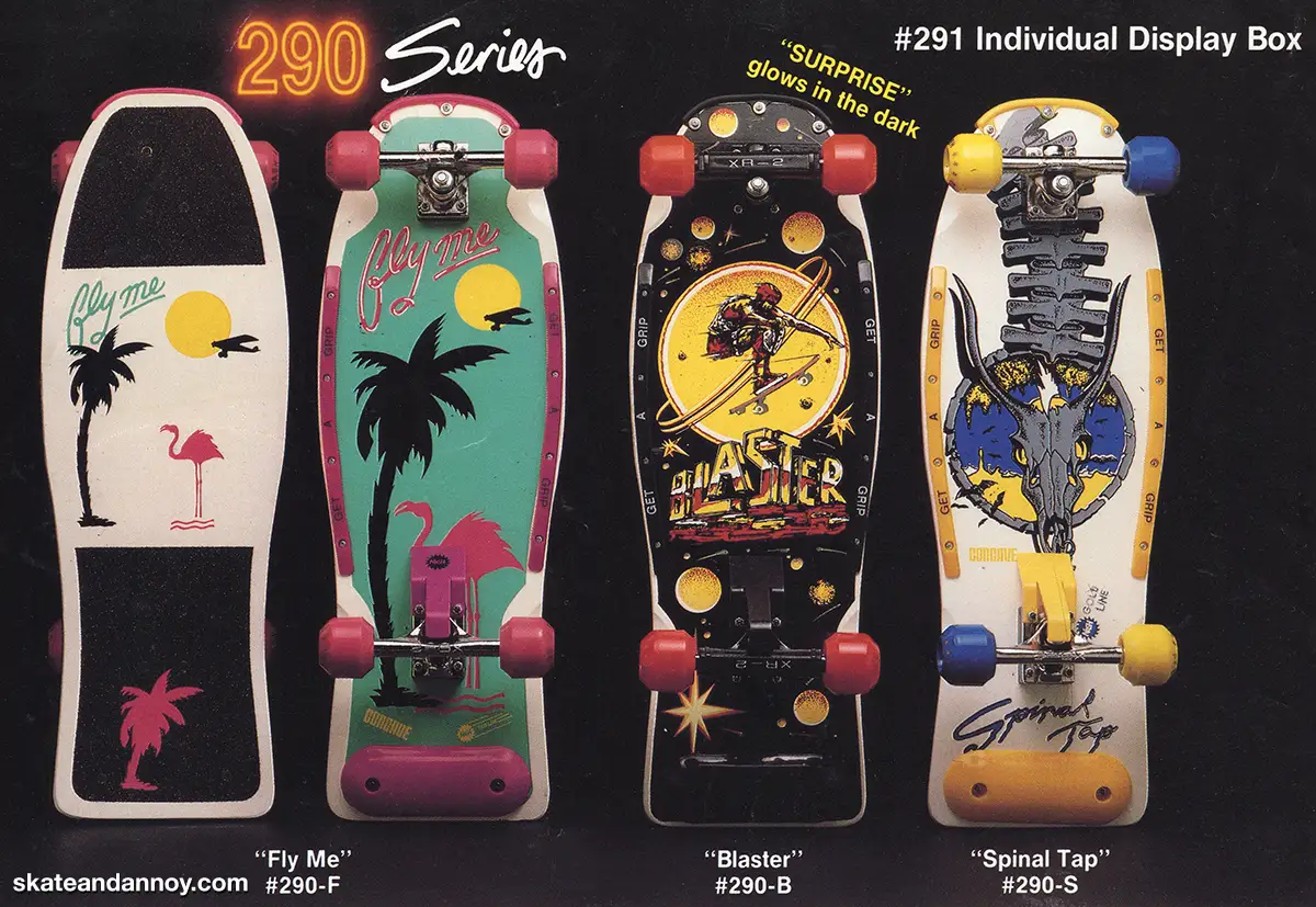 And now for the details… Page 2 featured the most well known Nash Boards, the Fly-Me from the the 290 series and of course, the Executioner II from the 259 Series. Executioner II? Near as I can tell the only difference between the Exexcutioner, and the Executioner II are the color ways. Based on this advert from 1986, The first version had a white dip and two-tone wheels. The Executioner II has two different colored wheels. It’s hard to tell what the reality is though. They could have changed color ways a the drop of a hat, and the Executioner II moniker might have just been a way to suggest it was somehow new. Also o shown on the left, the Blaster and Spinal Tap. These boards definitely did not go to 11.