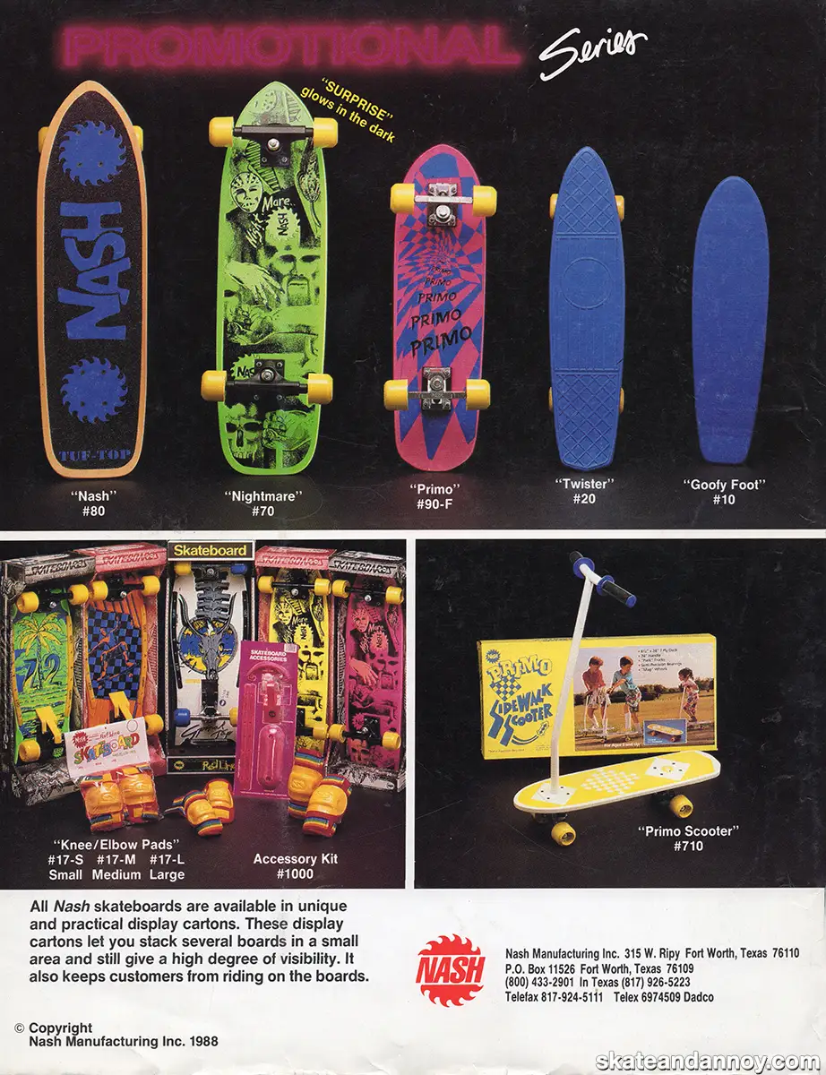 And now for the back cover details. This is kind of interesting. There appears to be a generic Nash deck with who knows what on the bottom, a Nightmare, the Primo, Twister, and Goofy Foot. The twister reminds me of the 70’s era acrylic deck from Nash sold, but those were flat on top.