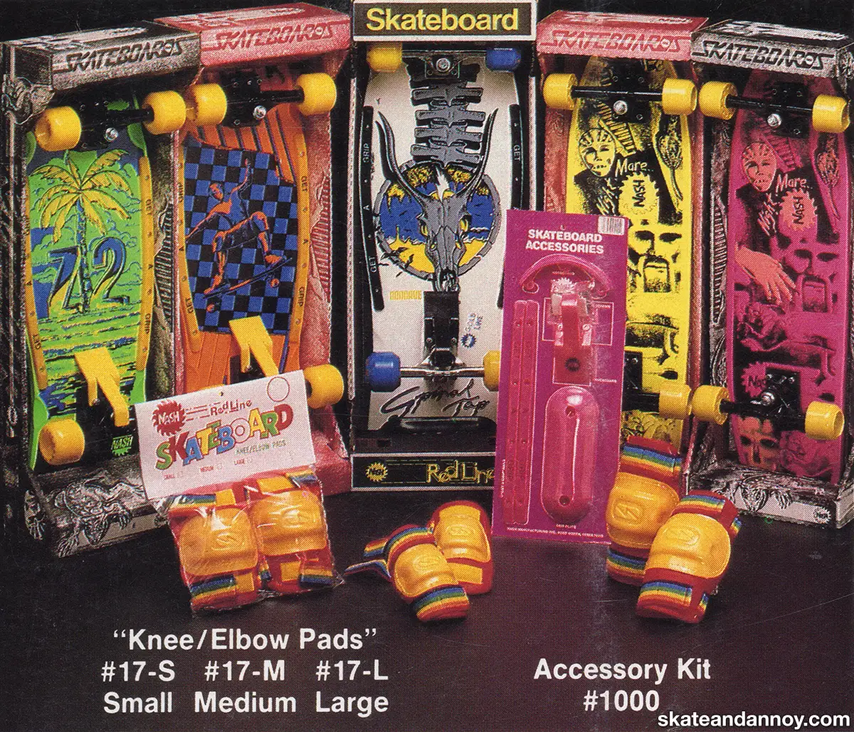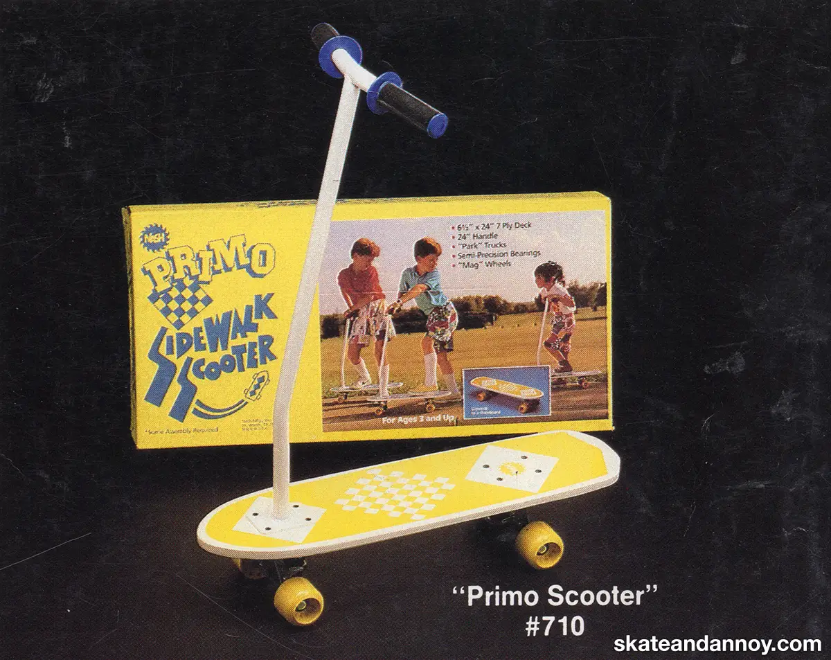 Here are some boxed versions of various boards. I can’t recall ever seeing that plastic accessory kit or knee/elbow pads for sale anywhere. Looks like the Primo came in a scooter model too.
