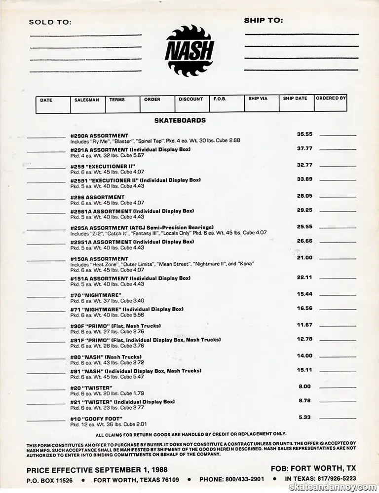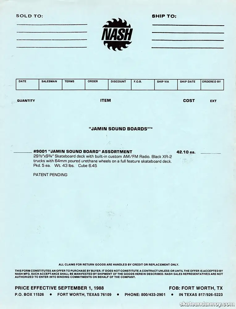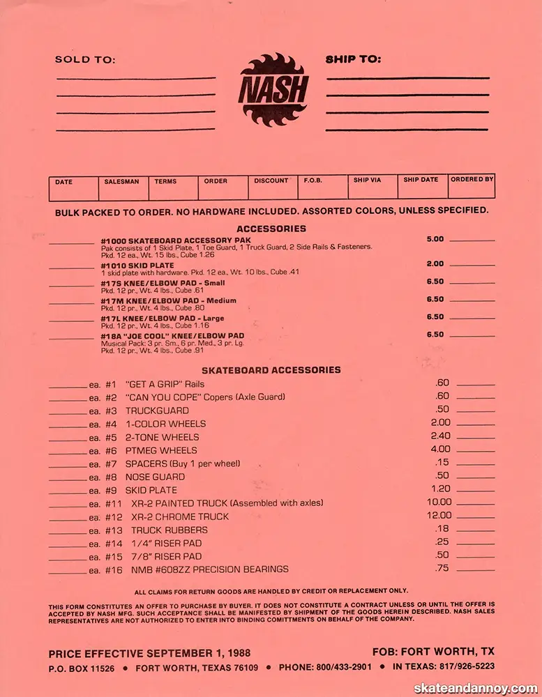 This is part 2 of the Nash catalog dump. Part one focused on Joe Cool/Snoopy and Mad Magazine. This is the rest of the 1988 wholesale catalog from 1988. The cover, back cover, and inside cover are all glossy color. There’s a glossy insert for another brand called Freesport, a couple glossy black and white inserts, including the legendary “Jam’n Sound Board” and DOZ’R locker boards, plus an assortment of color photocopied price sheets.
