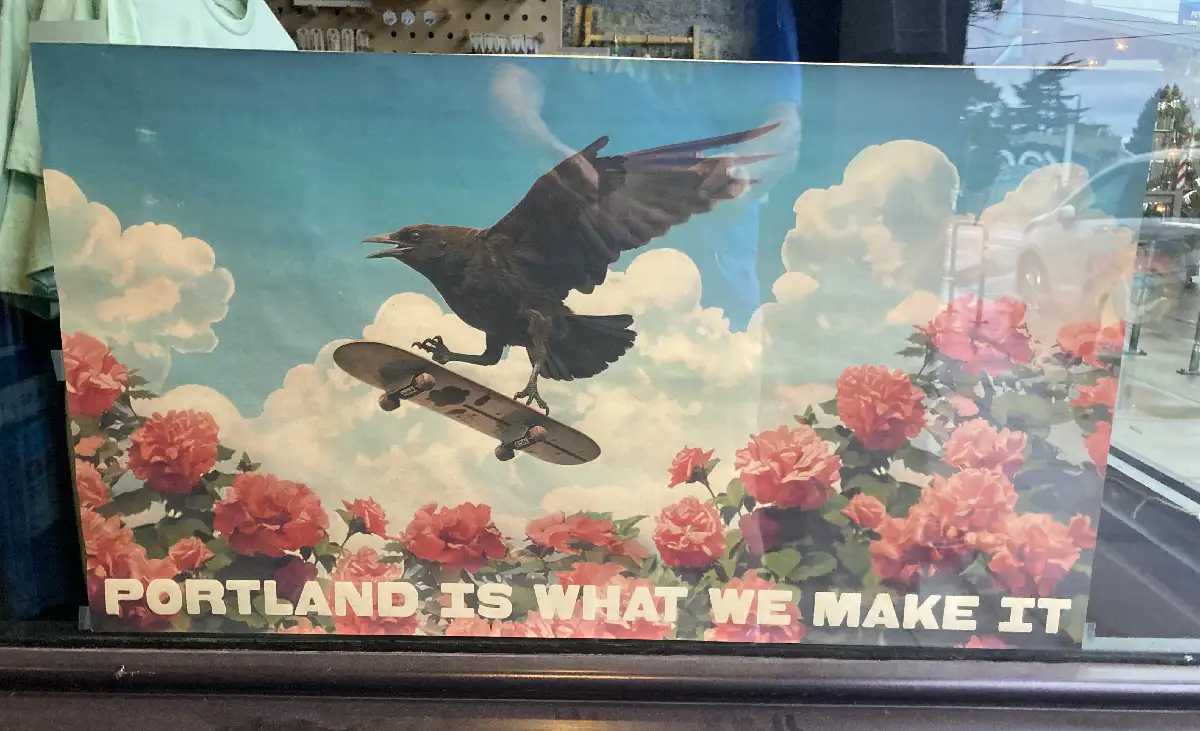 The orange-faced turd with a combover that sits in the Whitehouse thinks Portland is “Like living in hell” and has hinted he may send the National Guard here. Meanwhile, Portland does not give a toss what that jackass thinks, and we all remember what happened the last time he sent unmarked, masked police to randomly kidnap people off the streets. That truly was like living in a dystopian hell. Get bent Donny. This “Portland is what me make it” sign is in the window at Crafty Wonderland in their Alberta Street location, and has been for a few years. It’s kind of a reverse Portlandia episode, instead of “Put a bird on it” it’s “Put a skateboard on it.”