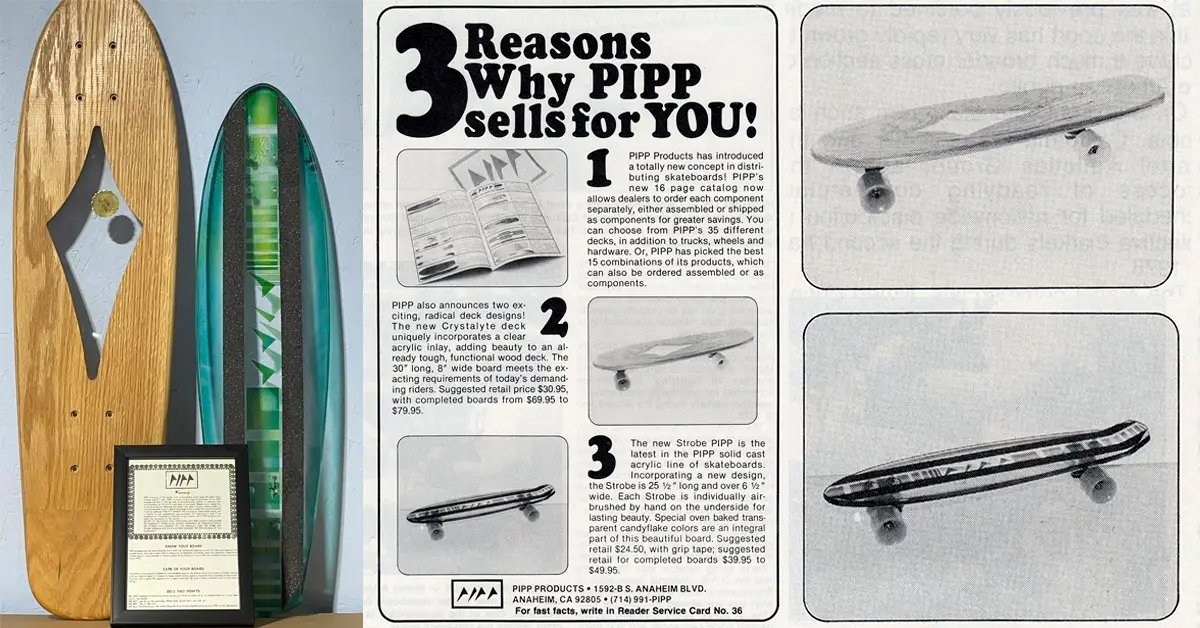 Ronald Chapman ( Chappman, not Chatman ) asked if this advert for Pipp products as featured in the Vintage Skateboard Magazine Ad gallery was for sale. I told him I wasn’t going to take apart an old skate magazine to sell an ad individually. I wish everyone felt that way actually. I was curious though, the advert wasn’t that interesting so I asked him why he wanted it. The simple answer is that he has the two products featured in the advert, and they are definitely more interesting in real life.