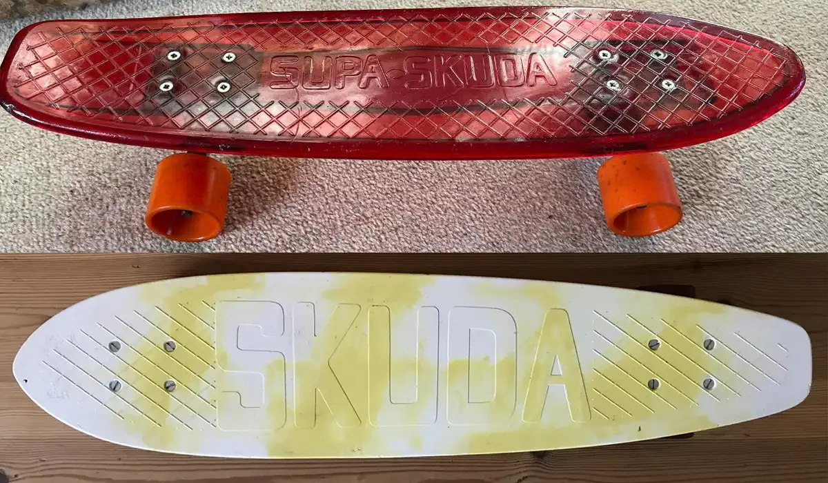 I was completely unaware of the Skuda brand of skateboards until I started posting ads from som UK-based magazines in the Vintage Skatemag Ads gallery. Like most overseas brands of the 70’s, they never had any market presence in the crowded USA market. Both of the Skuda ads I’ve seen so far are for some pretty nice looking wooden decks, but it looks like they also made some plastic decks. Photos courtesy of Jon Welton (red) and Adrian Wink (white/yellow) Update: added couple more.