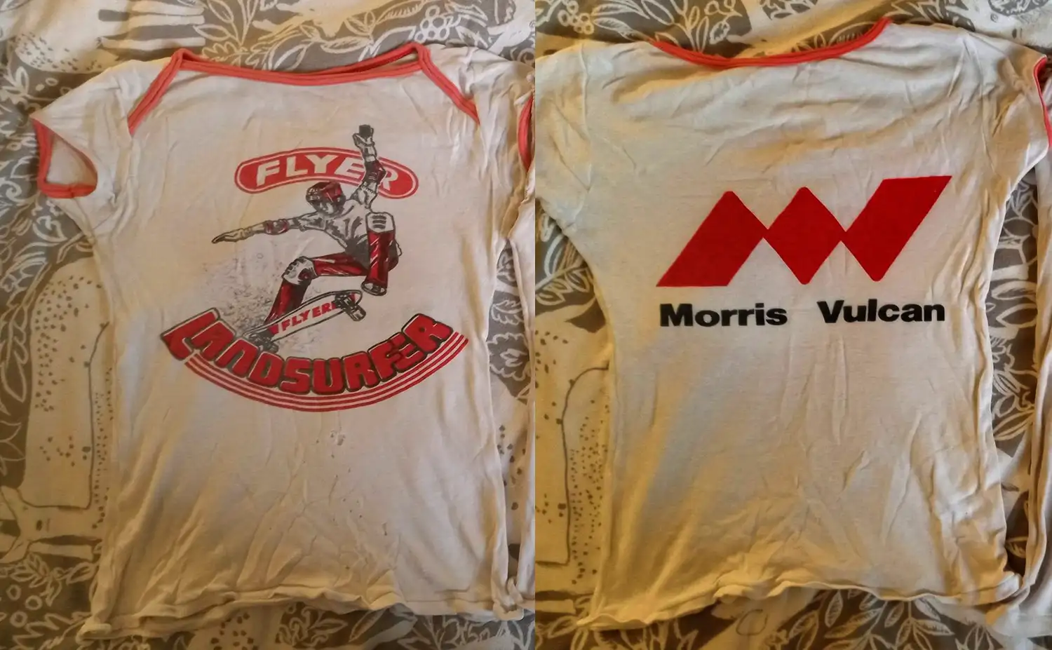 Adam Cox shared photos of two Flyer Landsurfer t-shirts from the 70’s. This is the front and back of one of them. Morris Vulcan was the UK-based manufacturer, Flyer was the brand and Landsurfer was the line. Or maybe it was actually “Flyer Landsurfer?” I can’t really tell. There’s currently one Landsurfer advert in the gallery, I thought I had a sticker tin he gallery but I was remembering a very small run (25) of reproductions I had made myself. Is it Landsurfer or Land Surfer? It depends on if you look at the t-shirt or the advert. More pics after the jump.