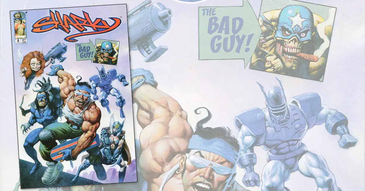 You’re looking at Sharky, Volume 1 #4 published by Image Comics isn 1998. You’d think with a skateboard featured prominently on this glorious cover that one would show up again on the inside pages. Alas, this is not the case. This is puzzling, but the whole comic book is puzzling. It’ shard to read, hard to follow, and feature a zombified (and evil) Captain America and Vampirella. Apparently Vampirella was on loan from another imprint. I’m not sure a how they got around Marvel with the Captain America zombie.