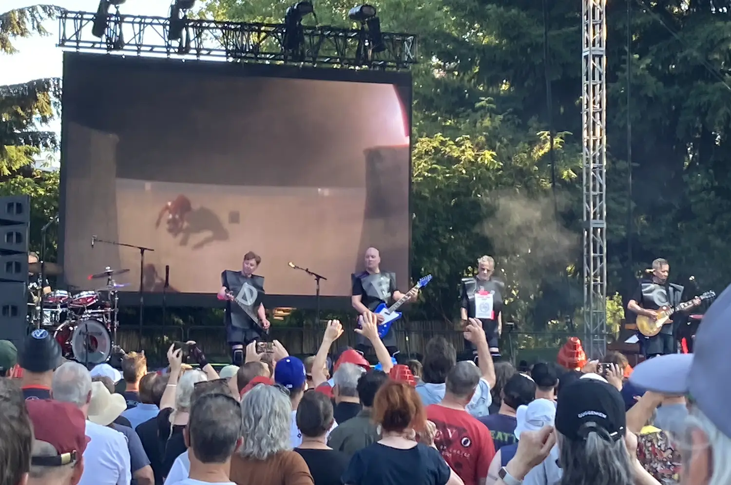 I caught DEVO in Seattle this weekend. It was a great show because it ended at 8pm and I didn’t have to stay up past midnight. And oh yeah, it was also a great show! They played for around an hour and a half or more, including a couple of quick costume changes. Aside from a couple songs in the first third of the set where it seems to drag a little, the rest of the night was very high energy. They opened with “Don’t Shoot (I’m A Man)” off Something For Everyone, and the rest was a mix of songs from Are We Not Men, Oh, No! It’s Devo, Freedom Of Choice, and Duty Now For The Future before closing with a guest appearance from Booji Boy singing “Beautiful World” off New Traditionalists. I found myself with a big stupid grin involuntarily plastered on my face the whole time, and Booji nearly brought me to tears with no alcohol or drugs involved! I highly recommend seeing them live if you can. Skateboarding? During “Freedom Of Choice” they showed some of the original music video footage shot at Marina del Rey skatepark on the big screen. We’re all DEVO.