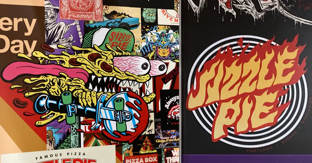 Spotted inside Portland’s amazing new airport, this wall mural for Sizzle Pie pizza. This is not the first time they’ve used skateboard imagery, but somehow I’ve neglected to document it here until now. This is a pretty good appropriation of Keith Meek’s Slasher graphic by the legendary Jim Phillips.