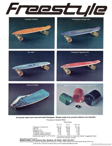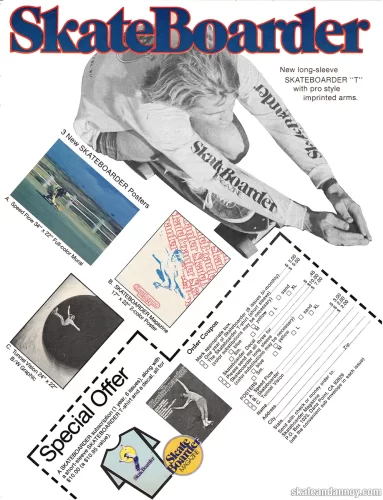 The Magazine: Volume 2 #5 June 1976 has 148 pages. The cover photo of Mike Weed in Mt Baldy Pipeline is by Warren Bolster. Feaures include interviews with Torger Johnson, “Long dogs with short tales” credits to John Smythe…,”Magic Rolling Board” from the upcoming Five Summer Stories film, an interview with Tom Sims, Skate Parks: Reality, contest roundups, A Mount Baldy photo spread, tips from Henry Hester on advancing slalom techniques, and an article from Chris Yandall titled “Cut the Jive & ‘Jog’.” It’s a how-to piece about the benefits of alternating your back foot pushing placement from the left to right sides of your board, which is… interesting. Aside from Mellow Cat and the usual sections. WHo’s Hot features Desiree Von Essen,Ed Nadine, Brad Logan, Tony Alva, Waldo Autry, (roller skater) Kenny Means, Mark Bowden, and Kevin Anderson.