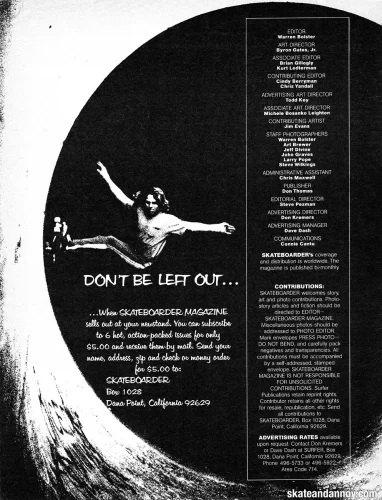 This Issue: Volume 2 #5 June 1976 has 148 pages. The cover photo of Mike Weed in Mt Baldy Pipeline is by Warren Bolster. Feaures include interviews with Torger Johnson, "Long dogs with short tales" credits to John Smythe...,"Magic Rolling Board" from the upcoming Five Summer Stories film, an interview with Tom Sims, Skate Parks: Reality, contest roundups, A Mount Baldy photo spread, tips from Henry Hester on advancing slalom techniques, and an article from Chris Yandall titled "Cut the Jive & 'Jog'." It's a how-to piece about the benefits of alternating your back foot pushing placement from the left to right sides of your board, which is... interesting. Aside from Mellow Cat and the usual sections. WHo's Hot features Desiree Von Essen,Ed Nadine, Brad Logan, Tony Alva, Waldo Autry, (roller skater) Kenny Means, Mark Bowden, and Kevin Anderson.