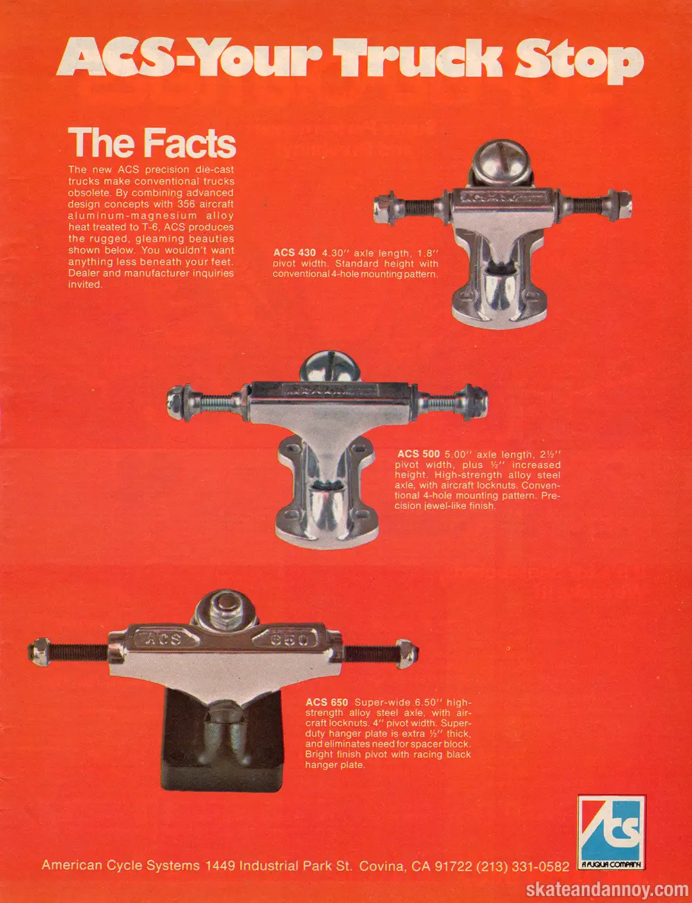 The new ACS precision die-cast trucks make conventional trucks obsolete. By combining advanced design concepts with 356 aircraft aluminum-magnesium alloy heat treated to T-6, ACS produces the rugged, gleaming beauties shown below. You wouldn’t want anything less beneath your feet. Dealer and manufacturer inquiries invited.