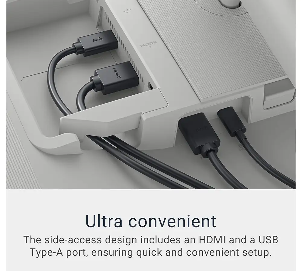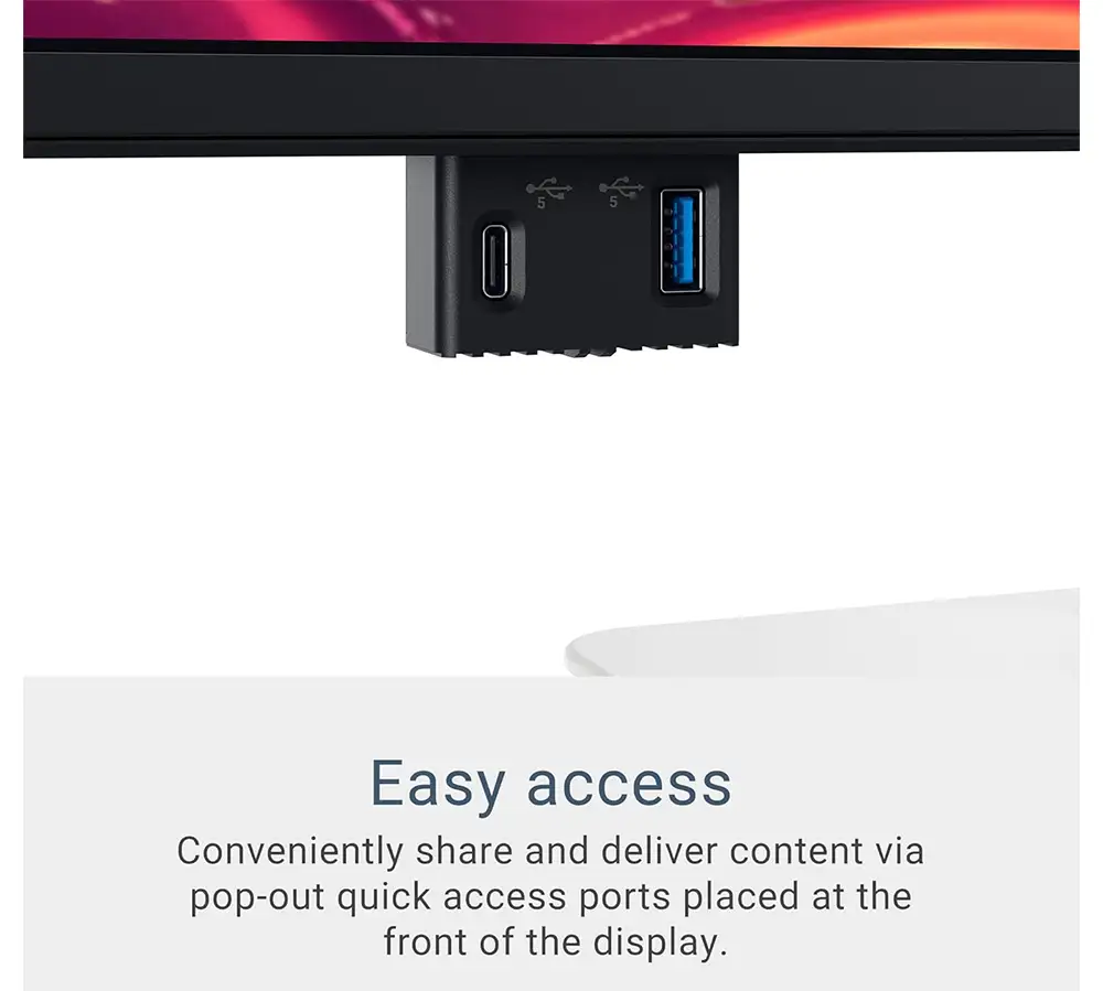 The display can swivel or pan, and the height can be adjusted. It does have a VESA mount if you have your own stand or mounting arm. Check out this nifty feature, The downstream USB A and C connectors live in their little pod that you press up and it slides down. This is nice because the ports are hidden when you aren’t using them, but are easily accessible when you do need them.